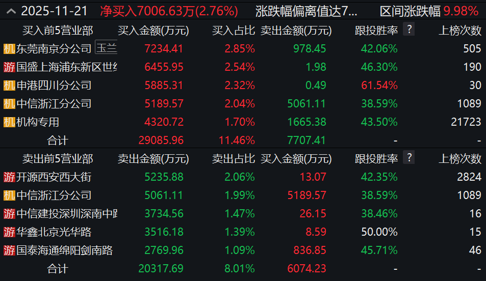 其中,东莞证券南京分公司、中信证券浙江分公司席位显示为机构席位;而游资席位开源证券西安西大街证券营业部开始大举卖出。